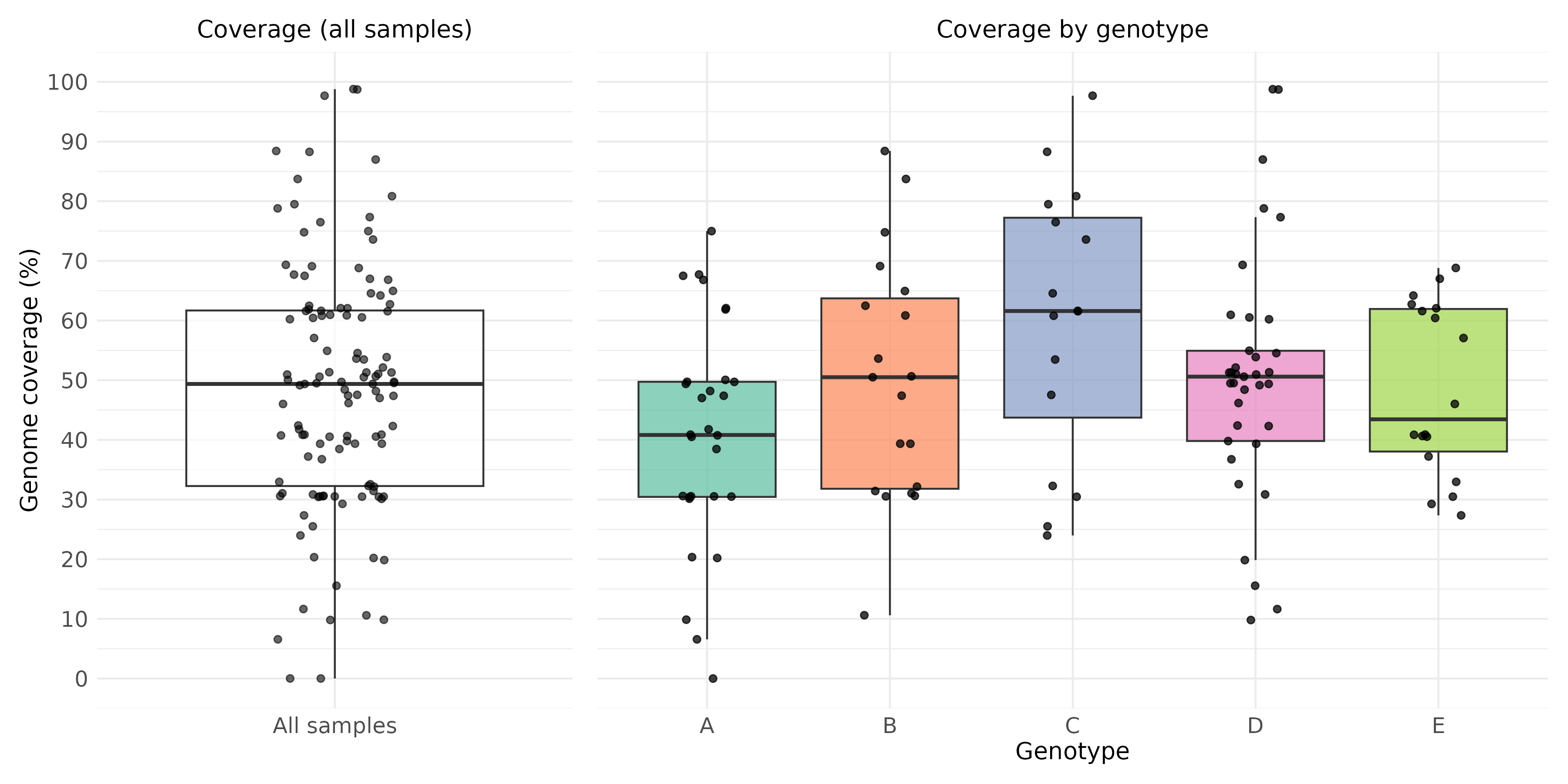 Across all samples, the median genome coverage was approximately 50%, although recovery varied widely, ranging from complete failure to nearly full genomes. Combining all primers into a single PCR reaction, or separating overlapping amplicons into different reactions, had little overall impact on genome recovery, and no consistent differences between the two pooling strategies were observed. In contrast, amplification efficiency differed markedly between individual amplicons. Amplicons 1–5 generally produced higher sequencing depth, whereas amplicons 6–10 frequently showed low coverage and contributed to incomplete genome recovery. Genome coverage was strongly associated with Ct values, with higher coverage observed in samples with lower Ct values, while coverage was broadly similar across genotypes.